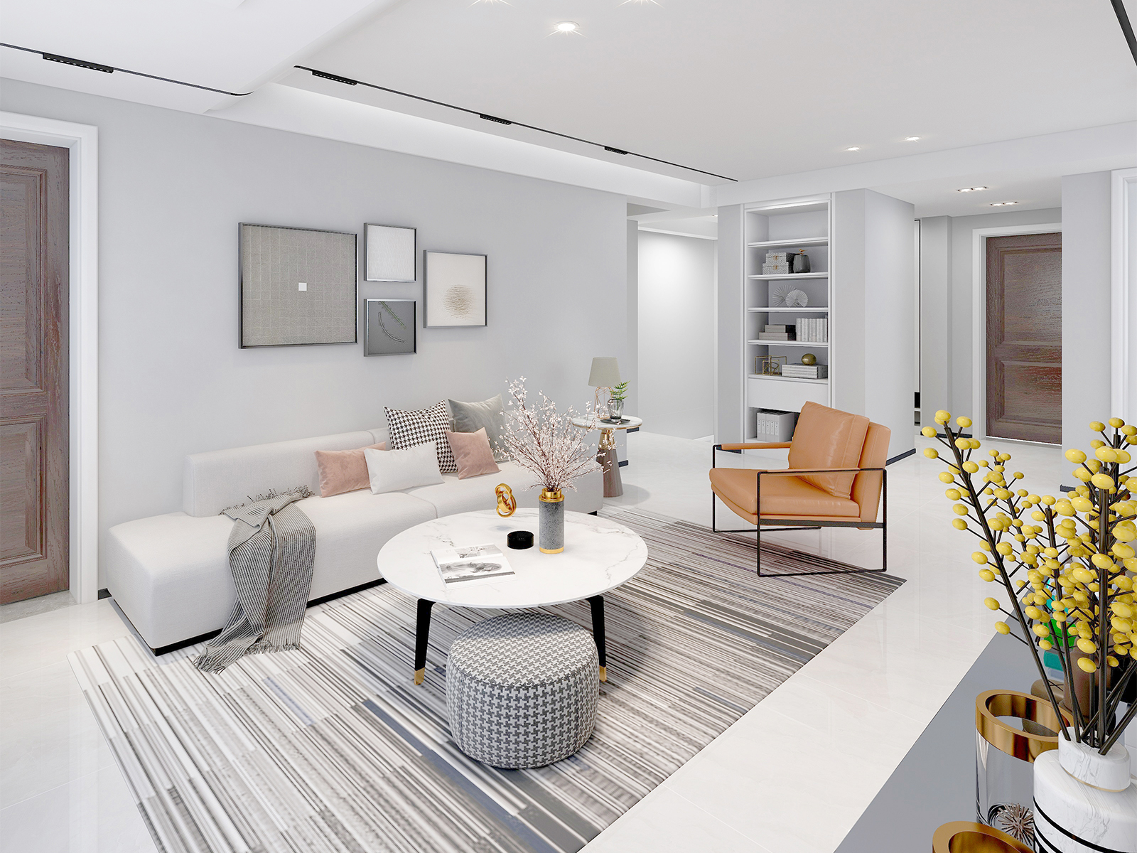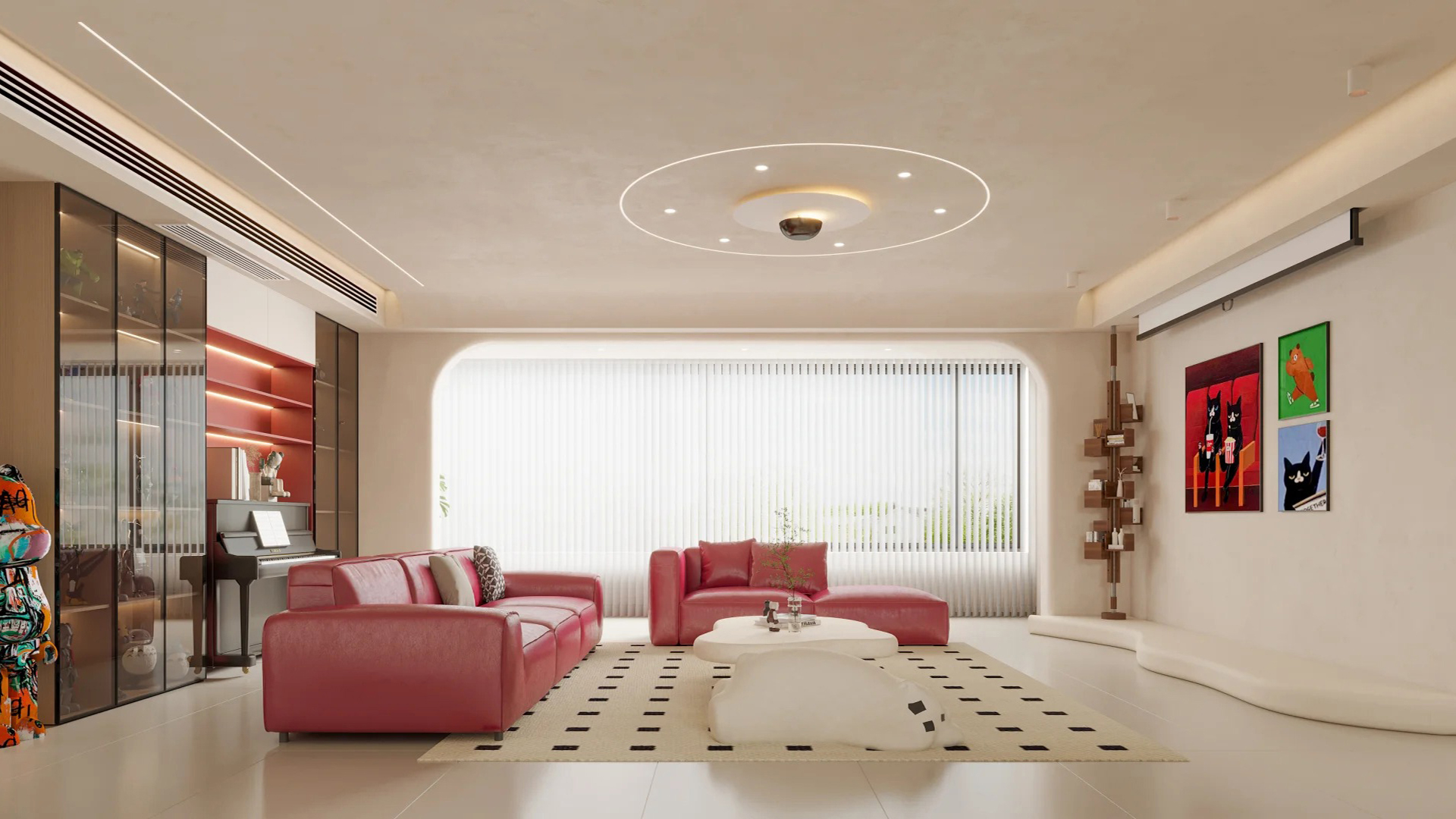 設(shè)計理念現(xiàn)代簡約空間,以白米交織的清新為基底,自然光線透過大窗與半透窗簾溫柔灑落,映照一室明媚。餐桌簡約而不失雅致,粉色靠墊輕點溫柔,幾何地毯鋪陳藝術(shù)韻律。畫作點綴墻面,棕色圓圈畫框引人遐想,綠植仙人掌添一抹生機盎然。整體設(shè)計,既顯寬敞明亮,又不失生活情趣與藝術(shù)品味。